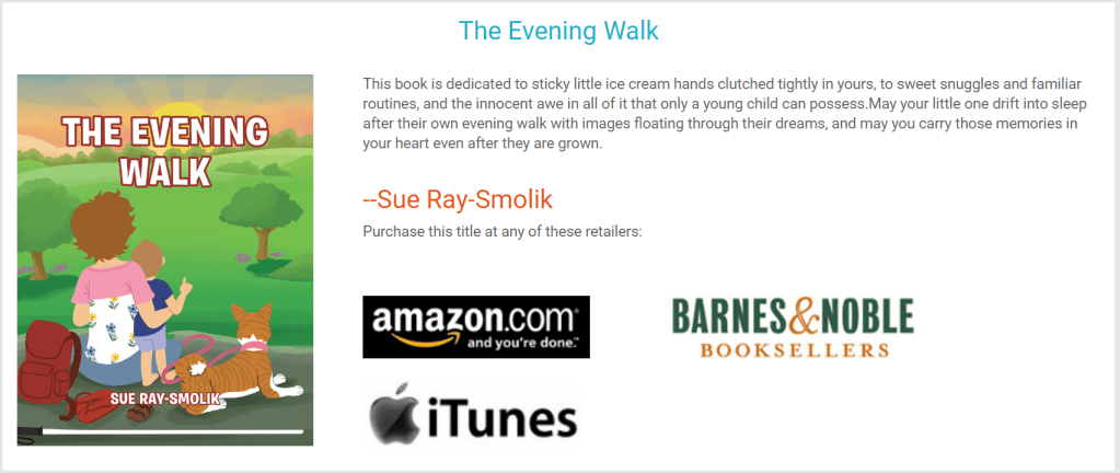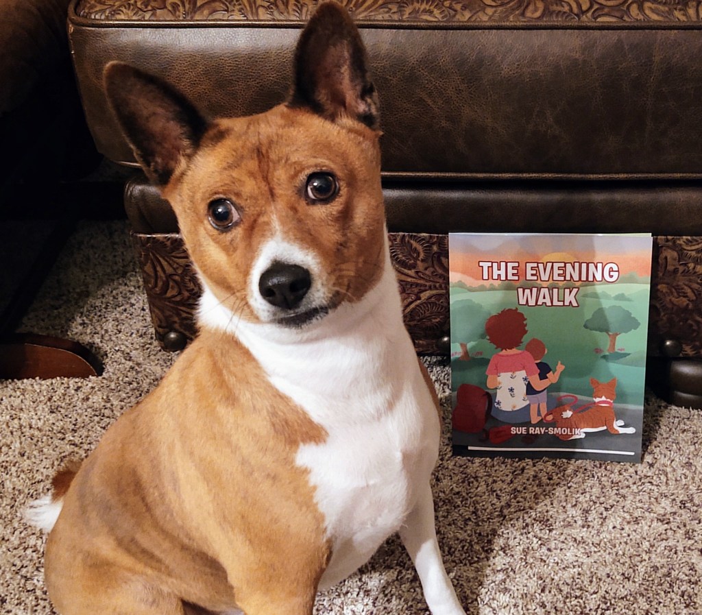 The Evening Walk is based on my visually impaired daughter, Stephanie, son-in-law, Bryan, and their toddler son, Liam. Tiggy even joins the story! I guess the lesson here seems to be…you might want to be careful hanging around me, it seems that you might end up in a book!